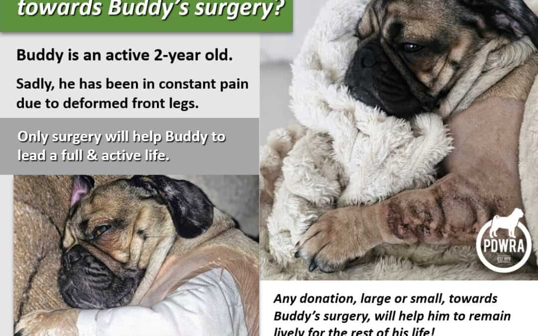 This is an example PDWRA’s care for pugs in need. Surgery of this nature is complicated and with risks, but weighing up Buddy’s age, his energy level and zest for life, the chance of a comfortable, full life for his future could not be denied to him.