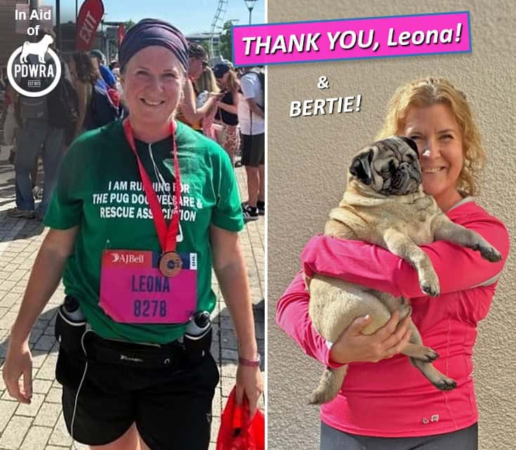 Leona said “I’m running to raise money for this wonderful charity that I adopted our pug Bertie from. They helped me daily whilst I got to know Bertie and paid for the operations he needed, which cost a lot! They do this for every pug in their care that needs medical help. I also volunteer with them, helping to find new homes for pugs.