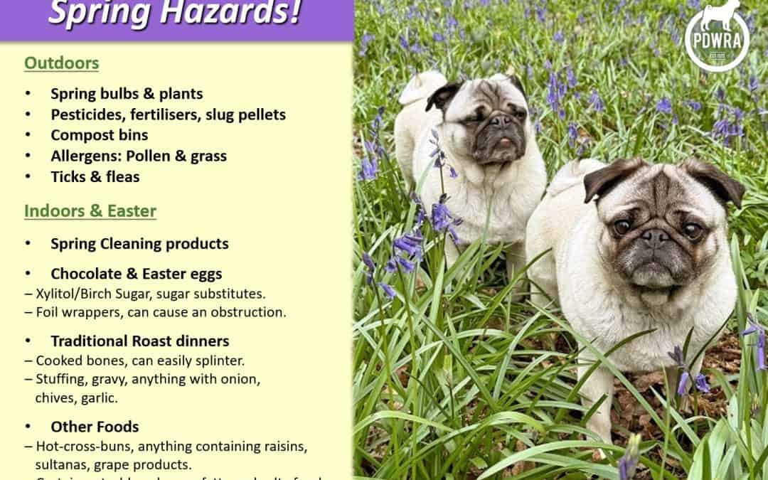 Keen to be outdoors with winter behind us, springtime activities such as gardening and picnicking can expose our pugs to potential hazards like pesticides, fertilizers, and sharp tools/objects.